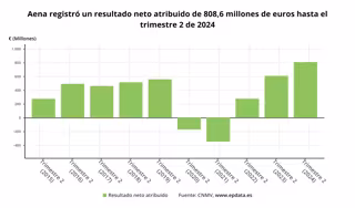 El gestor aeroportuario Aena registró un beneficio de 808,6 millones de euros en el primer semestre del año lo que supone un 33% más que la cifra registrada en el mismo periodo del pasado año, según las cuentas remitidas por la compañía a la Comisión Nacional del Mercado de Valores (CNMV) este miércoles.