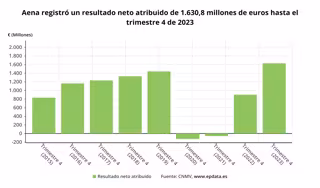 Aena registró un beneficio neto récord de 1.630,8 millones de euros en 2023, cifra un 80,9% superior a la de 2022, tras registrar extraordinarios financieros, entre ellos las remuneraciones de depósitos en Brasil (36,3 millones de euros) y las diferencias por tipo de cambio (11,2 millones de euros).