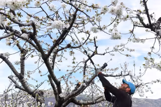 Un agricultor, Miguel Domínguez poda un cerezo durante su floración en una de las sierras del Valle del Jerte en Valdastillas, Cáceres, Extremadura, - Gustavo Valiente - Europa Press