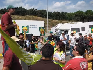 Un centenar de pagesos de diversos sindicats agraris han repartit aquest dijous fullets informatius i peces de fruita entre els vehicles procedents de França que travessaven la frontera a l'altura de la Jonquera per conscienciar sobre la crisi de preus que pateix el sector.