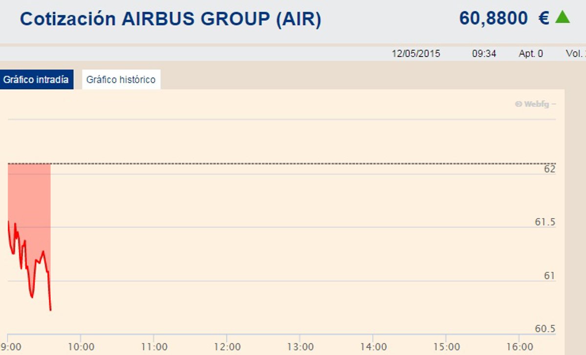 Las acciones de Airbus Group han comenzado la sesión de este martes con un descenso del 0,46%, hasta marcar un precio de 61,80 euros por título, después del recorte del 2,07% sufrido ayer en la primera sesión tras el accidente de un A400M ocurrido en Sevilla el pasado sábado.