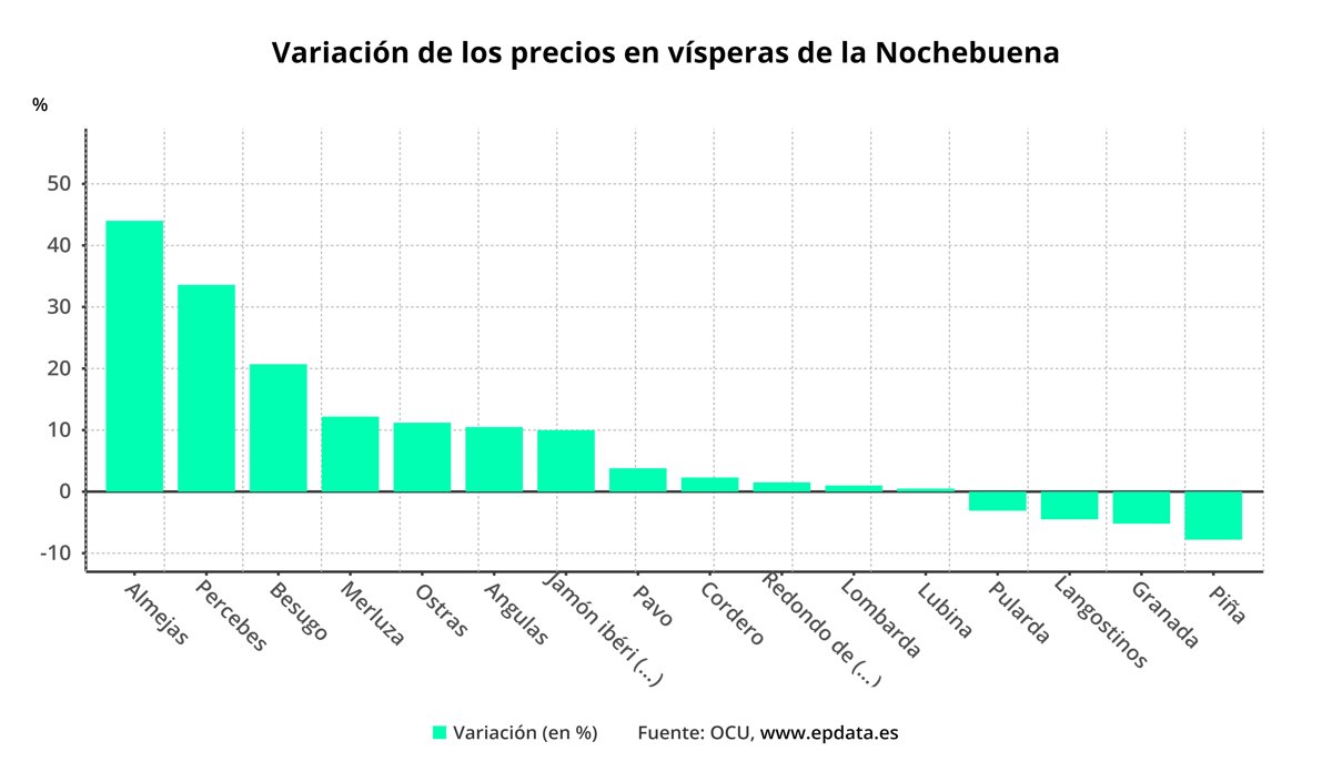 En comparación con los niveles de precios del año pasado, los precios se han encarecido un 4,2% y la mayoría de los productos ha recuperado los niveles de precios de 2018-2019. De hecho, cinco de los 16 productos de la cesta (cordero, pularda, pavo, lombarda y almejas) tienen los precios más elevados desde 2015, cuando OCU puso en marcha este observatorio de precios navideños.
