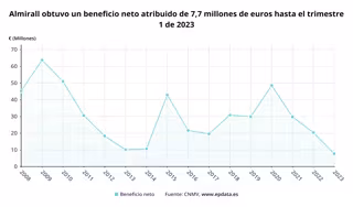 Almirall obtuvo un beneficio neto de 7,7 millones de euros en el primer trimestre del año, cifra un 62,3% inferior a la del mismo periodo de 2022, según ha informado la compañía biofarmacéutica a la Comisión Nacional del Mercado de Valores (CNMV).