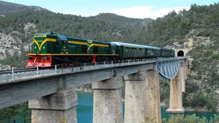 Después, el tren continúa su trayecto por la cuenca del río Noguera Pallaresa, cruzando embalses y cordilleras montañosas como el Montsec, hasta la Pobla de Segur, la última parada.