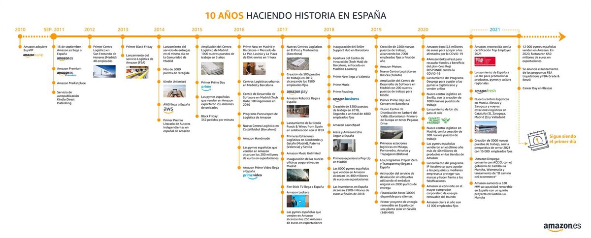 Amazon celebra este miércoles su décimo aniversario de su desembarco en España con su plataforma Amazon.es, acelerando el 'ecommerce', y desde entonces ha impulsado su presencia en el mercado nacional donde ha invertido más de 6.800 millones de euros, según ha informado el gigante del comercio electrónico en un comunicado.