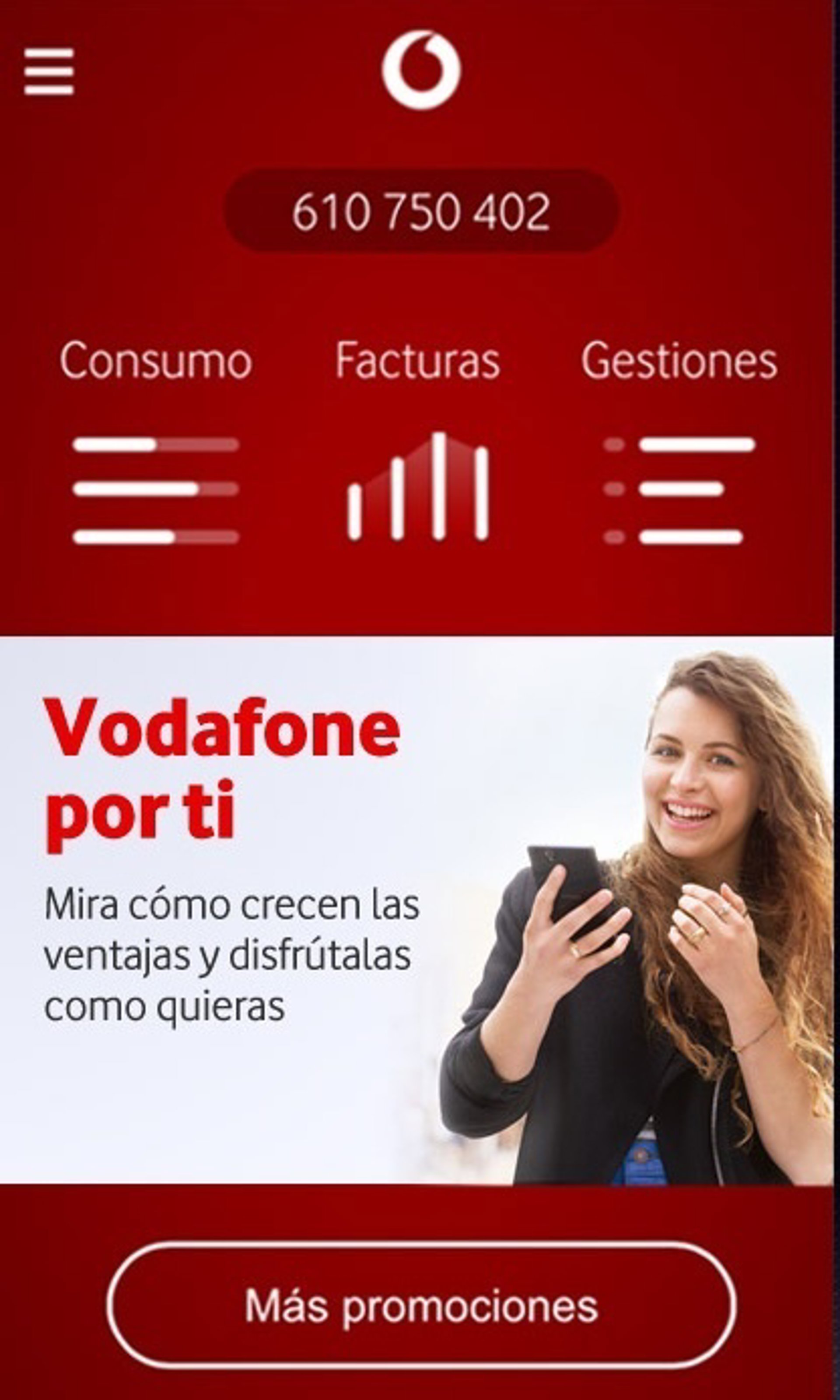 Esta aplicación, lanzada en 2011, permite gestionar todos los servicios de móvil, fijo y fibra o ADSL. En concreto, esta solución permite, entre otras cuestiones, consultar las últimas facturas y ver el histórico mensual, cambiar de tarifa, ver el consumo, localizar la tienda Vodafone más cercana, renovar el móvil, consultar el código PIN y PUK, modificar el contestador y contratar servicios.