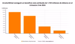 ArcelorMittal obtuvo un beneficio neto atribuido de 1.729 millones de dólares (1.607,4 millones de euros) en los primeros nueve meses de este año, lo que representa un descenso del 55,5% en comparación con el resultado contabilizado en el mismo periodo de 2023, según ha informado este jueves la compañía siderúrgica, que ve las condiciones actuales del mercado "insostenibles".