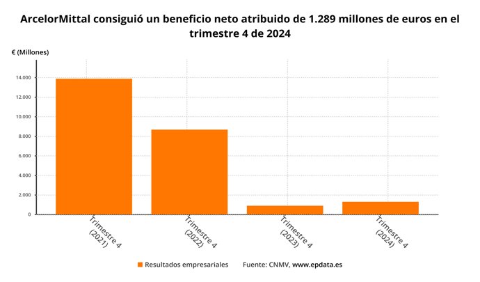 ArcelorMittal obtuvo un beneficio atribuido de 1.339 millones de dólares (1.289 millones de euros) en 2024, cifra un 45,7% superior a la de 2023, cuando ganó 919 millones de dólares (884,6 millones de euros), según ha informado este jueves el gigante siderúrgico.
