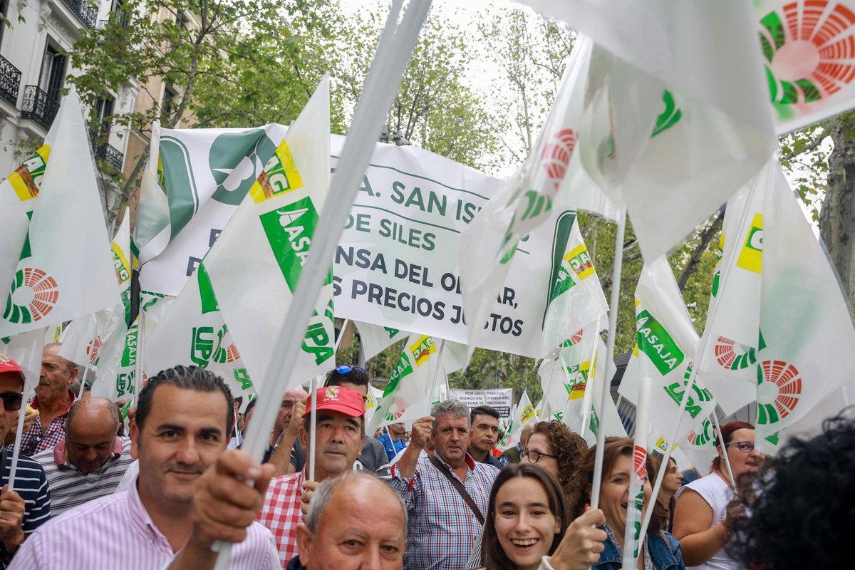 Numerosas personas con pancartas en la manifestación convocada por COAG, UPA, Asaja y Cooperativas Agro-Alimentarias en defensa del olivar tradicional ante la crítica situación que atraviesa el sector por los bajos precios en origen del aceite de oliva - Ricardo Rubio - Europa Press - Archivo