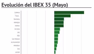 De esta forma, tan solo 13 valores se tiñeron de verde al finalizar el quinto mes del año. Gamesa encabezó las subidas, con una revalorización del 16,56%, seguida de Técnicas Reunidas (+9,04%). Más lejos se situaron Iberdrola, Abengoa e Inditex, las tres por encima del 5%.