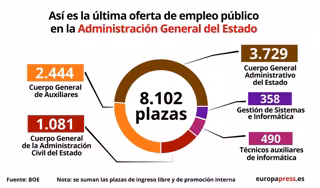El Boletín Oficial del Estado (BOE) publica hoy la convocatoria de diversas oposiciones para cubrir un total de 8.102 plazas en la Administración General del Estado. La mayor parte de los puestos corresponden a la Oferta de Empleo Público de 2018, aunque para algunos cuerpos también se incluyen plazas de la Oferta de Empleo Público de 2019.