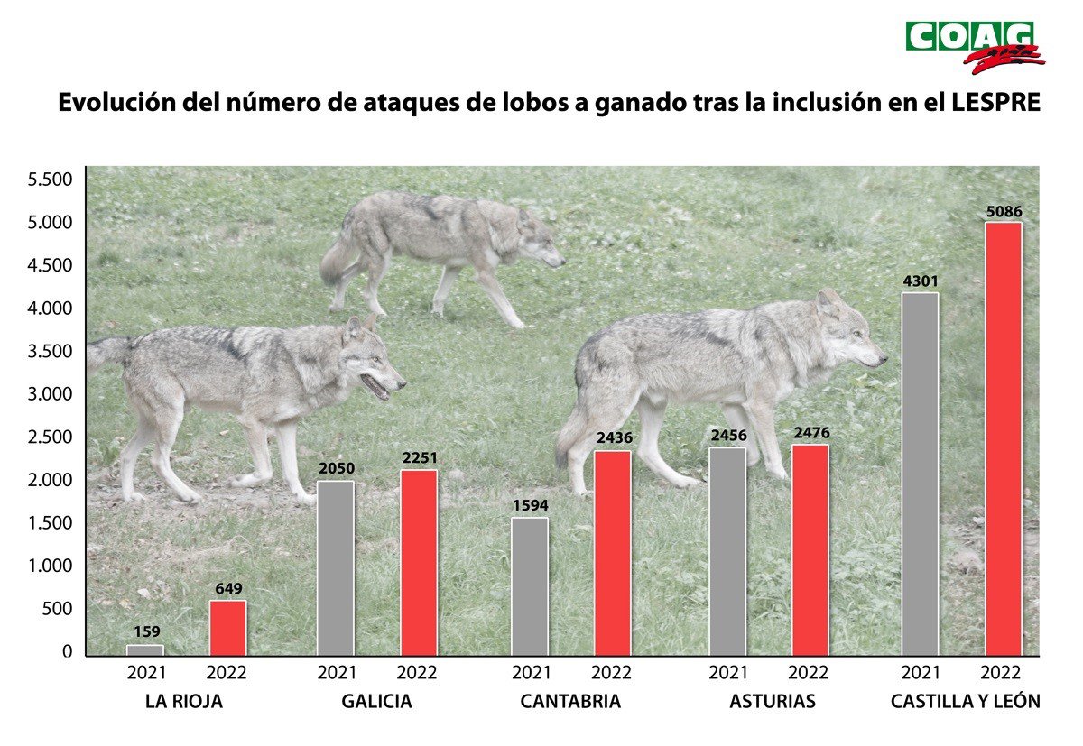 Asimismo, según los datos aportados por Coag, en el primer año de inclusión del lobo en la lista LESPRE, los ataque han crecido en un 19% por lo que el portavoz de ganadería y Lobo de esta organización, Gaspar Anibatarte, considera que hay que hacer "una profunda reflexión sobre el efecto de una medida ultra proteccionista tomada sin atender a razones objetivas sobre la situación real de la especie, que está en expansión y no en peligro, y sin escuchar a las zonas y sectores más afectados".
