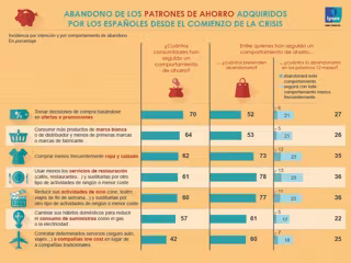 La recesión económica que ha atravesado el país ha supuesto un cambio en los hábitos de consumo. En este sentido, el informe refleja que el 70% de los españoles ha basado su ahorro en la adquisición de productos en oferta o promociones. Asimismo, el 64% ha asegurado que su consumo de productos de marca blanca ha aumentado. El sector textil también ha salido perjudicado, ya que el 62% ha reducido el gasto en ropa o calzado.