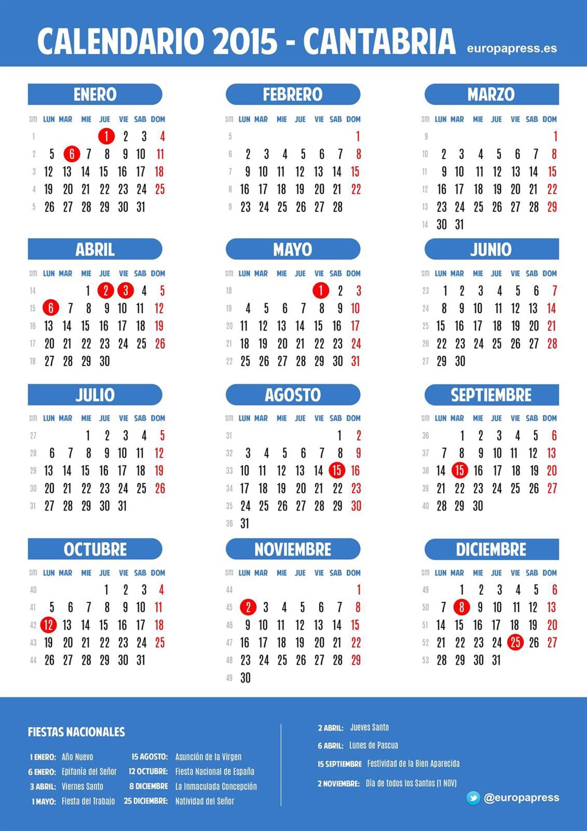 El calendario laboral para 2015 recoge ocho fiestas nacionales, una menos que en 2014, de las que sólo tres se celebrarán entre semana, permitiendo tomarse un puente largo: el jueves 1 de enero, el martes 6 de enero y el martes 8 de diciembre.