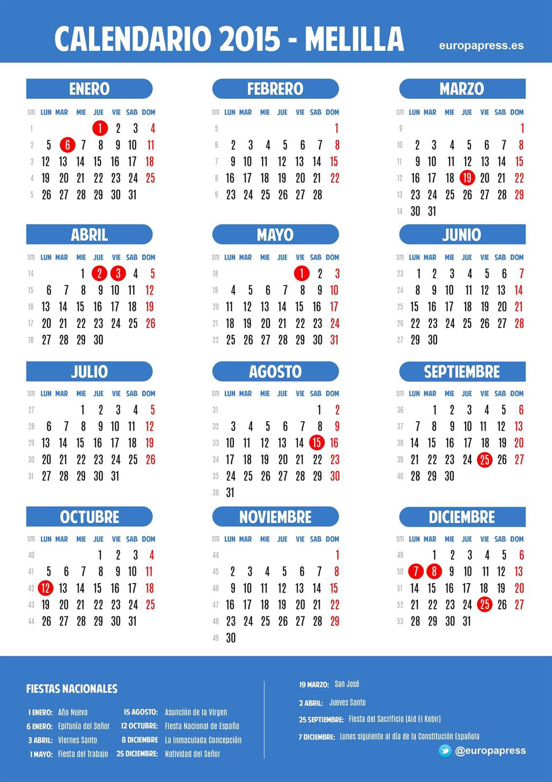 El calendario laboral para 2015 recoge ocho fiestas nacionales, una menos que en 2014, de las que sólo tres se celebrarán entre semana, permitiendo tomarse un puente largo: el jueves 1 de enero, el martes 6 de enero y el martes 8 de diciembre.