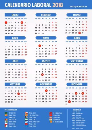 Por comunidades autónomas, además de los comunes, el calendario laboral de 2018 incluye los siguientes festivos: