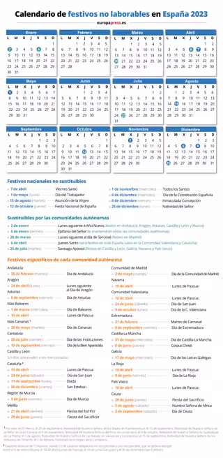 *Según el BOE, Ceuta tendrá en 2023 una fiesta más "por no coincidir con domingo un suficiente número de fiestas nacionales para poder establecer una de las fiestas tradicionales de la ciudad de Ceuta, siendo la siguiente: Día 2 de septiembre: Día de Ceuta".
