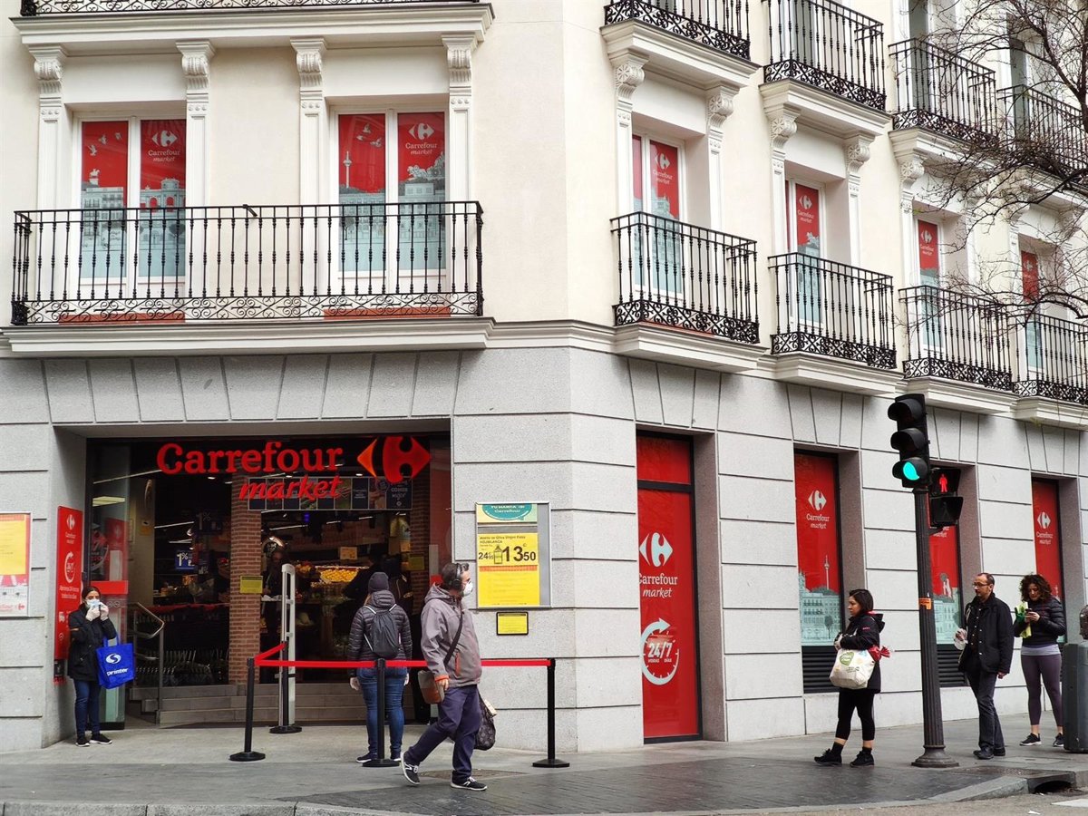 Carrefour, que desde este lunes establece un horario de apertura de 9.00 a 21.00 horas (antes cerraba a las 22.00 horas, controla el aforo de clientes para evitar aglomeraciones y recomienda a sus clientes que acuda una persona por familia.
