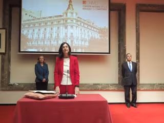 La presidenta de la CNMC, Cani Fernández, en su toma de posesión, con la vicepresidenta de Asuntos Económicos, Nadia Calviño, al fondo a la izquierda - CNMC - Archivo