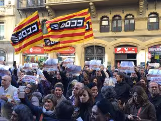 Los dos centenares de personas agolpadas a las puertas de la sede de CC.OO. de Cataluña han cortado el tráfico durante más de media hora, han entonando el cántico 'Libertad presos políticos', y han llevado consigo carteles en los que se leía 'Libertad, os queremos en casa'.