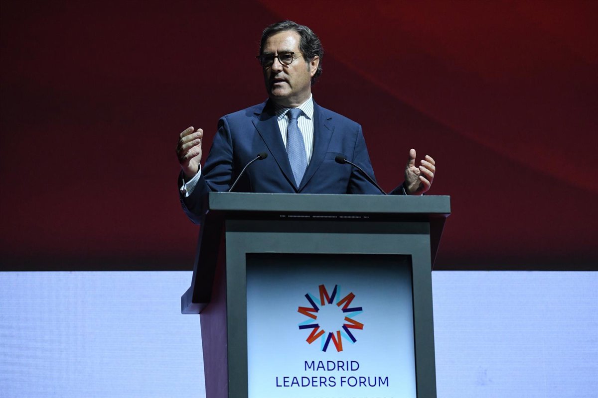 El presidente de la CEOE, Antonio Garamendi, interviene durante la inauguración de la II edición de Madrid Leaders Forum, en el Teatro Goya Multiespacio de Madrid, a 4 de octubre de 2023, en Madrid (España). - Fernando Sánchez - Europa Press