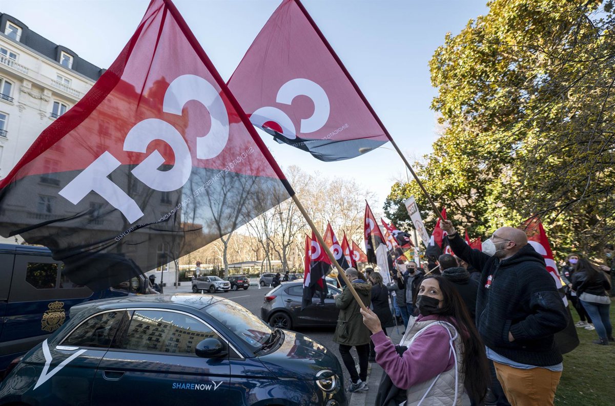 Archivo - Varias personas con banderas de CGT, en una concentración para denunciar el bloqueo de la negociación del convenio sectorial del Contact Center, en la Plaza de la Lealtad, a 22 de febrero de 2022, en Madrid (España). - Alberto Ortega - Europa Press - Archivo