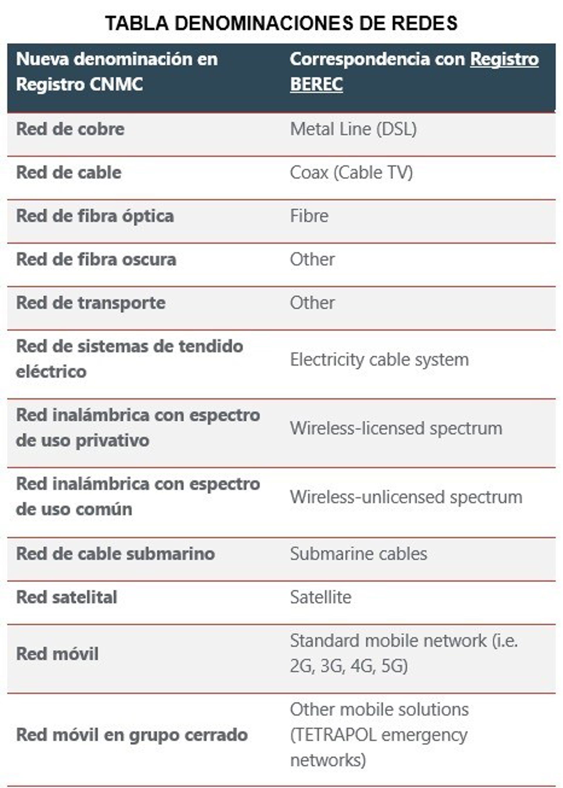 Además, las inscripciones de redes se ajustan al carácter multiservicio de las infraestructuras actuales y se alinean con la clasificación de redes del Berec, al tiempo que con esta modificación, el número de denominaciones en el Registro se reduce de 26 a 12.