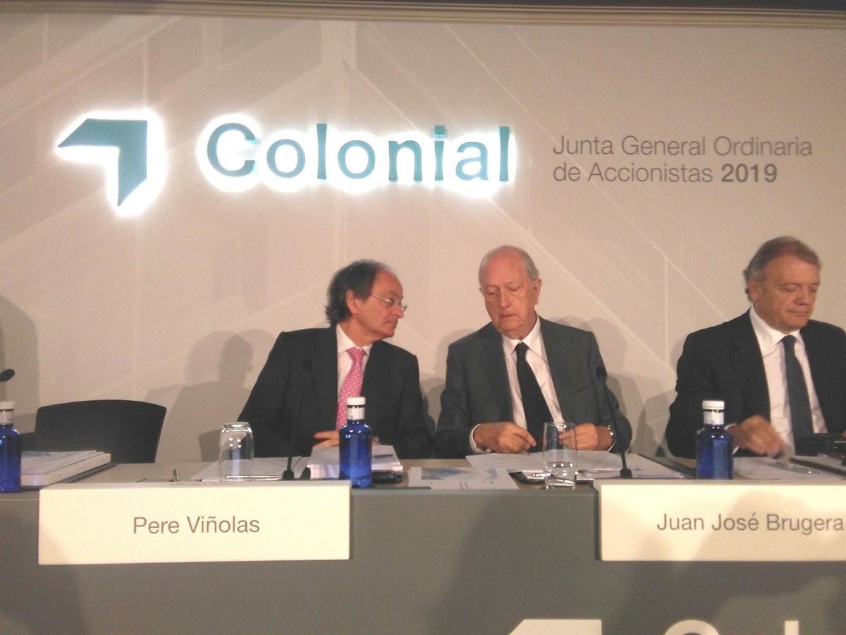 El presidente de Colonial, Juan José Bruguera, y el consejero delegado, Pere Viñolas, en la junta de accionistas 2019 de la compañía.