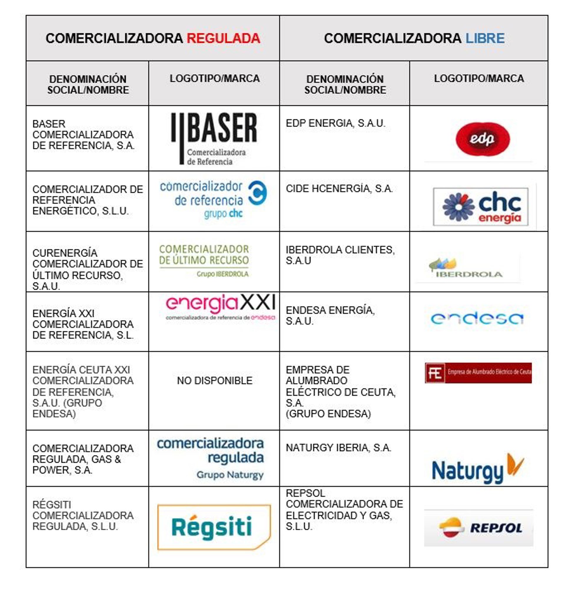 Por lo que respecta a las comercializadoras libres de estos grupos su denominación social es: Endesa Energía, Iberdrola Clientes, Naturgy Iberia, EDP Energía, Repsol Comercializadora de Electricidad y Gas, Cide HCEnergía y Empresa de Alumbrado Eléctrico de Ceuta (Grupo Endesa).