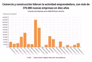 Los sectores de comercio y construcción lideraron la actividad emprendedora, con 220.479 y 155.091 nuevas empresas creadas, respectivamente, entre 2008 y octubre de este año, según datos analizados por el Gabinete de Estudios Económicos de la agencia de rating Axesor.