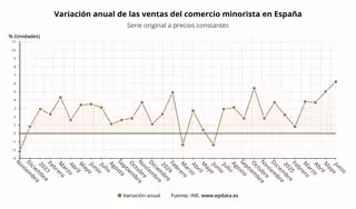Las ventas del comercio al por menor registraron un avance interanual del 6,2% en junio, una tasa 1,2 puntos superior a la del mes anterior, según datos publicados este martes por el Instituto Nacional de Estadística (INE).