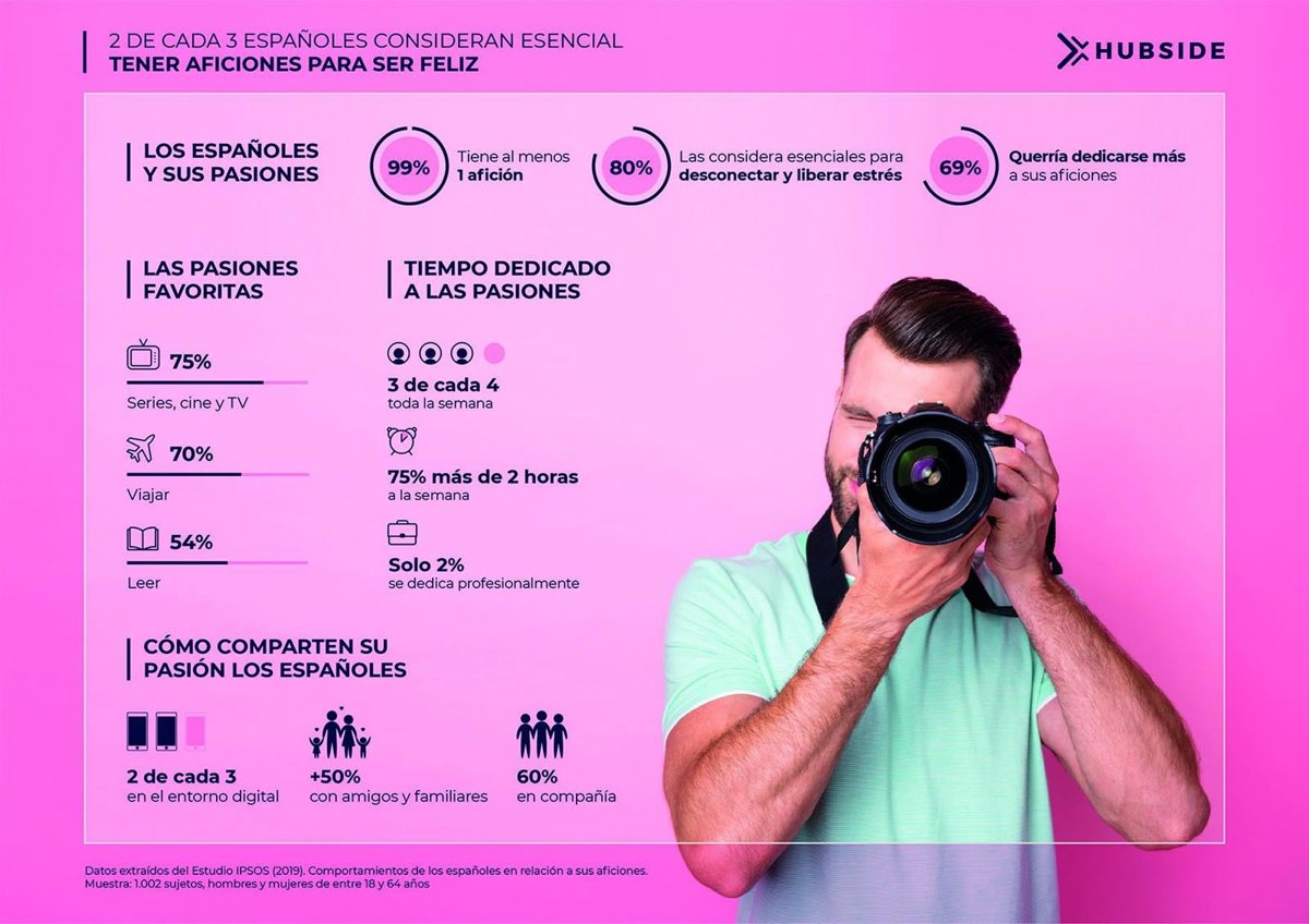 Según el "Estudio de las pasiones de los españoles", elaborado por IPSOS para Hubside, la mayoría de los españoles tiene al menos una pasión, pero el 42% no quiere dedicarse a ella de forma profesional porque dejaría de ser divertida. Las series y películas, viajar y leer, las principales aficiones de los españoles en su tiempo de ocio. 2 de cada 3 españoles no dedica todo el tiempo que querría a sus hobbies, aunque el 75% los practica durante toda la semana, una media de más de 2 horas