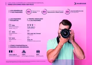 Las aficiones son imprescindibles para los españoles y un 99% asegura tener al menos una pasión, que considera esencial para ser feliz (67%) y desconectar de la rutina diaria y liberar estrés (80%), según revela el Estudio de las pasiones llevado a cabo por Hubside en colaboración con IPSOS. Sin embargo, sólo el 2% de los españoles se dedica de forma profesional a su pasión y el 42% no quiere hacer de su hobby su trabajo, porque se convertiría en rutina y dejaría de ser divertido.