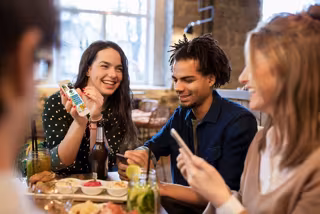 Friends with smartphones and food at bar or cafe - SYDA PRODUCTIONS - STOCK.ADOBE.C / LEV DOLGACHOV