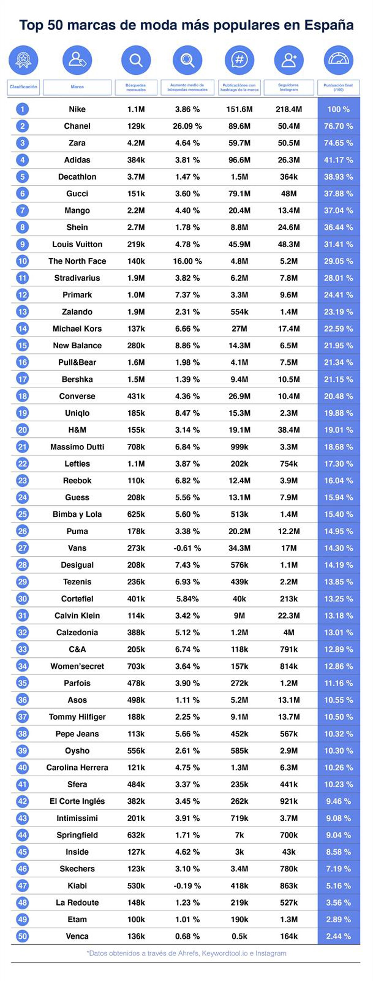 El gigante de la ropa deportiva, Nike, domina el nuevo ranking de la moda con un impresionante número de seguidores en redes sociales, 218.4 millones de seguidores en Instagram y más de 150 millones de publicaciones con hashtags "La firma de diseño Chanel ha crecido en popularidad online más que cualquier otra marca en los últimos 12 meses, con un incremento medio de las búsquedas mensuales del 26.09 %. " Las marcas deportivas y de athleisure ocupan 4 de los 10 puestos de la lista de marcas más populares