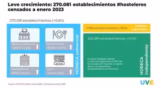 Tras un año con poca variación de establecimientos abiertos, España sigue siendo un gran mercado en número de locales categorizados como HORECA Comercial o Tradicional. El informe "UVE Data Market Horeca 2022" indicaba la existencia de 268.370 establecimientos, mientras que, en el mismo periodo del 2023, los datos arrojan una cifra de 270.081 locales, aumentando el número de establecimientos en un 0,6%.