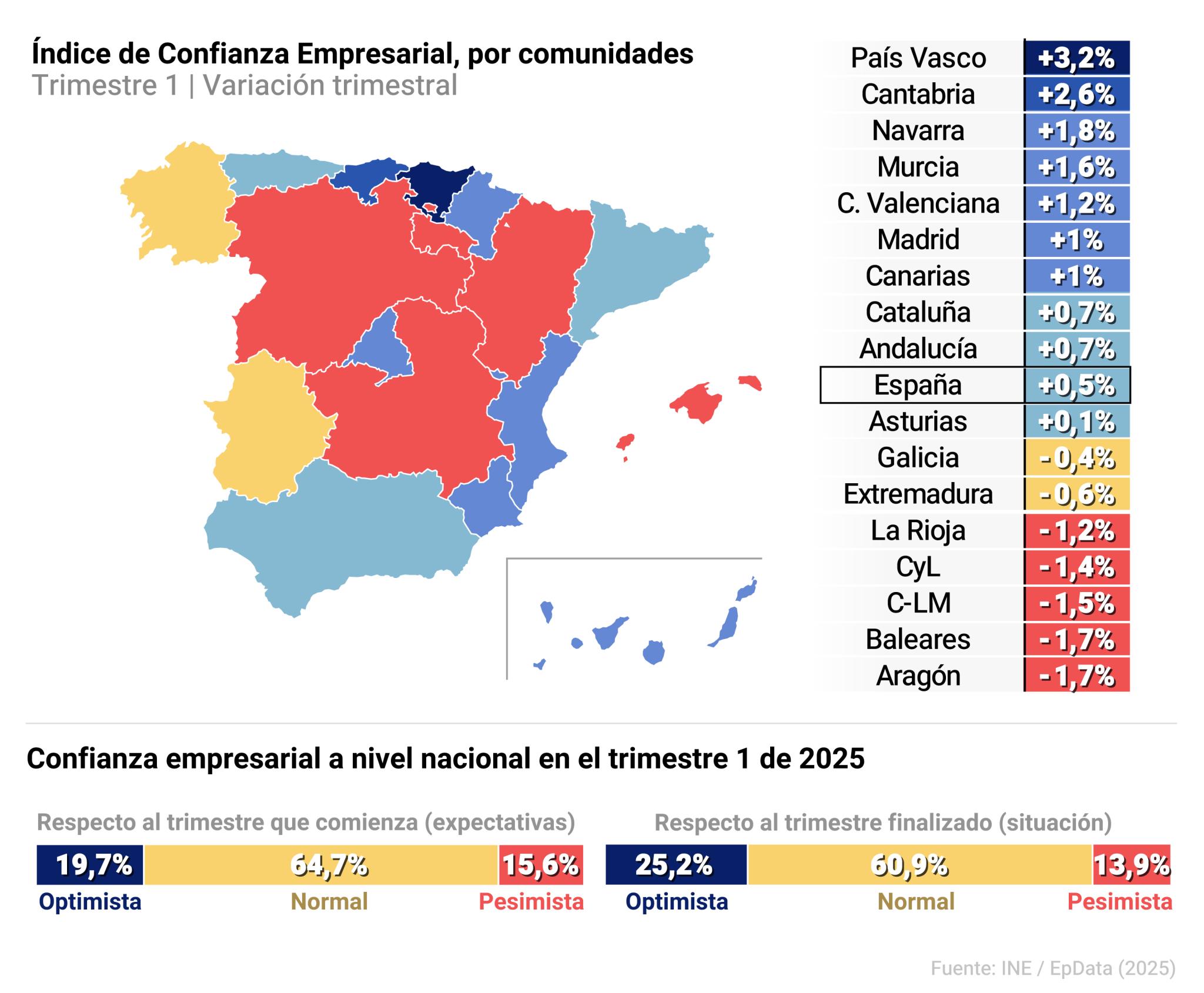 En el otro extremo, la confianza empresarial registró sus mayores incrementos en País Vasco (+3,2%), Cantabria (+2,6%), Navarra (+1,8%) y Murcia (+1,6%).