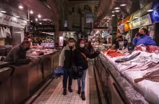 Dos personas pasan por un puesto de pescado en el Mercado Central de Valencia, a 24 de marzo de 2022 - Rober Solsona - Europa Press