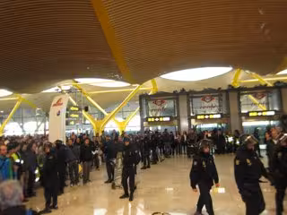 La presencia policial ha despertado el interés y curiosidad de los viajeros, muchos de los cuales hacen cola esta mañana en los puntos de información de las diferentes compañías, cuyos vuelos se han visto afectados, en busca de información y alternativas de viaje.