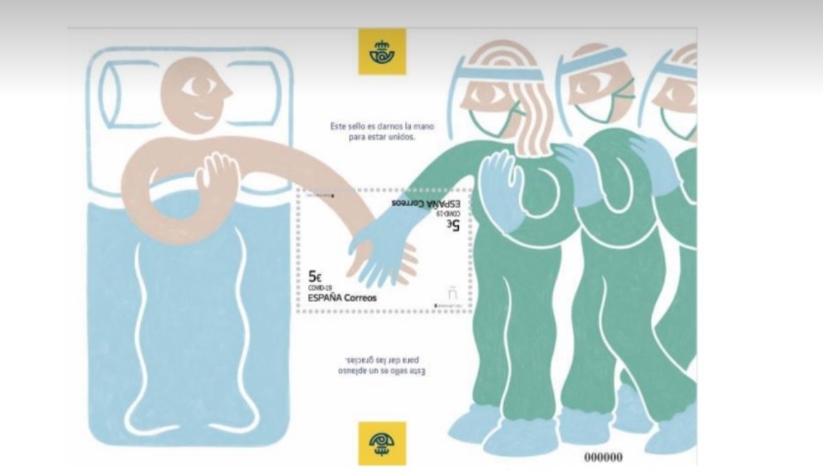 En el sello se representan las manos estrechadas de un sanitario y un paciente que dan y reciben apoyo y, al girar el sello hacia arriba, esas mismas manos también representan el aplauso, un gesto muy repetido durante la pandemia para expresar ese agradecimiento.
