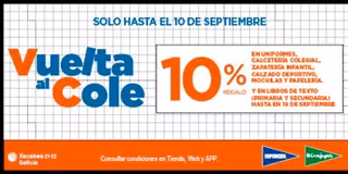 Estas bonificaciones serán canjeables hasta el 31 de octubre en compras superiores a 30 euros en departamentos como papelería, mochilas, electrónica, electrodomésticos, deportes, moda, accesorios, zapatería, belleza, hogar y juguetes, excepto en calzado de uniformidad, uniformes y calcetería colegial, libros y libros de texto, material deportivo, consolas, videojuegos, contenido digital y marcas de lujo.