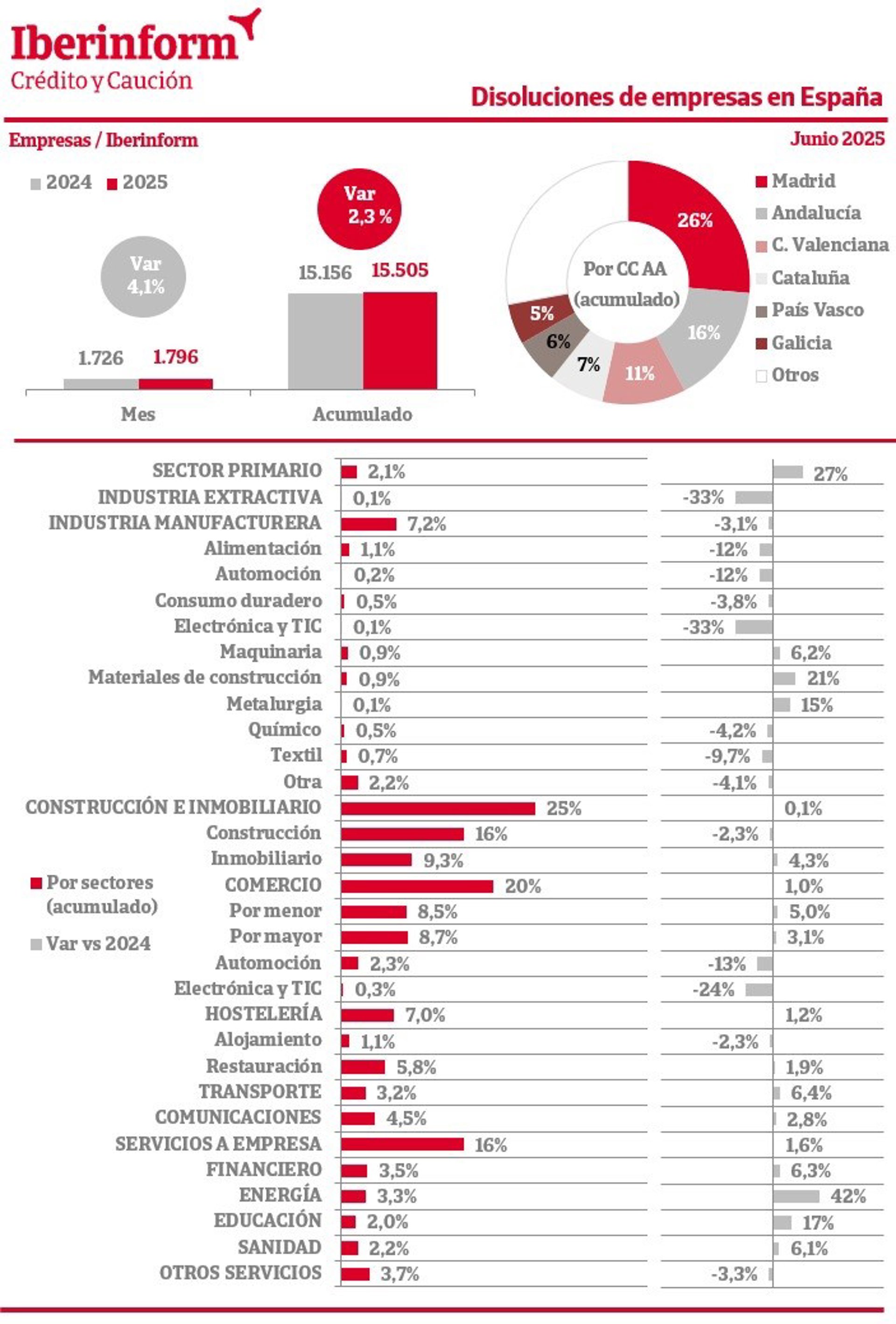 Por su parte, los datos de junio muestran que la disolución de empresas registró un aumento del 4,1% respecto al mismo mes del ejercicio anterior, hasta las 1.796, mientras que en el conjunto del año anotó una subida del 2,3%, con 15.505.