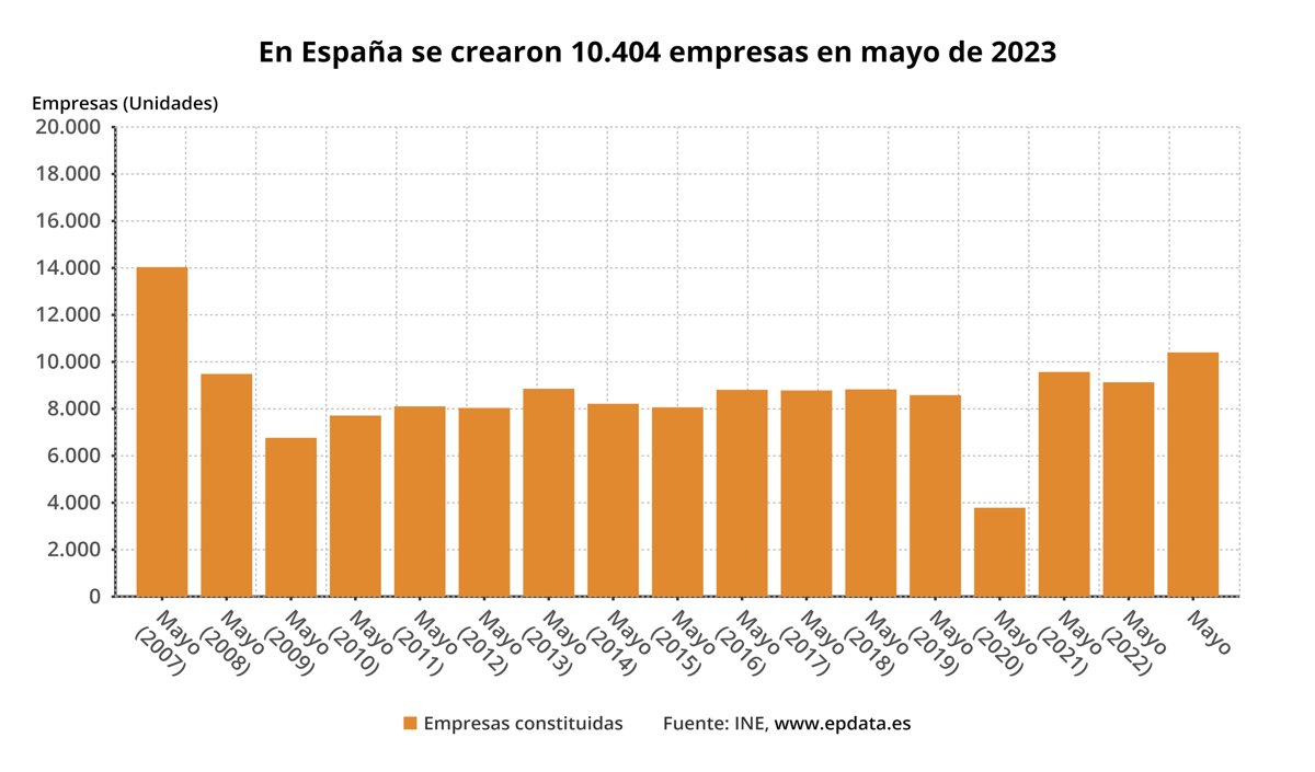 El número de nuevas sociedades mercantiles se disparó un 13,9% el pasado mes de mayo respecto al mismo mes de 2022, hasta sumar un total de 10.404 empresas, su mayor cifra en un quinto mes del año desde 2008, según los datos difundidos este viernes por el Instituto Nacional de Estadística (INE).
