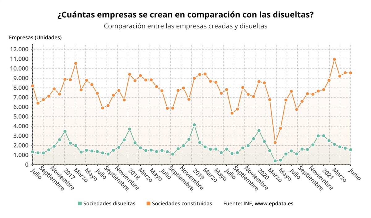 El número de nuevas sociedades mercantiles se disparó un 41,8% en junio en relación al mismo mes de 2020, hasta totalizar 9.554 nuevas empresas, la cifra más alta en un mes de junio desde 2007, según los datos difundidos este jueves por el Instituto Nacional de Estadística (INE).