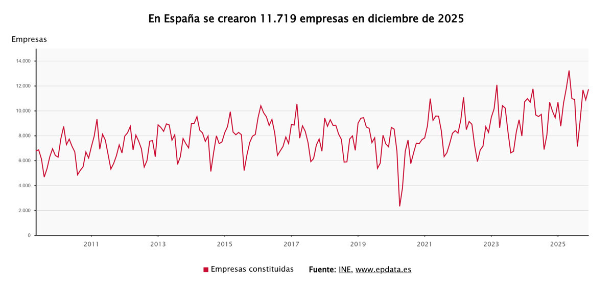 En el último mes del año pasado se crearon 11.719 sociedades mercantiles, cifra un 24,2% superior a la del mismo mes de 2024 y la más elevada en un mes de diciembre de toda la serie histórica.