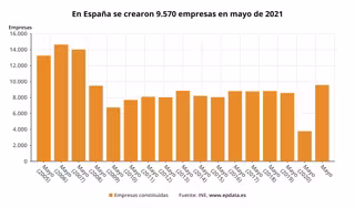 El número de nuevas sociedades mercantiles se multiplicó por más de dos en mayo al registrar un crecimiento interanual del 152,4%, hasta totalizar 9.570 nuevas empresas, la cifra más alta en un mes de mayo desde 2007, según los datos difundidos este jueves por el Instituto Nacional de Estadística (INE).