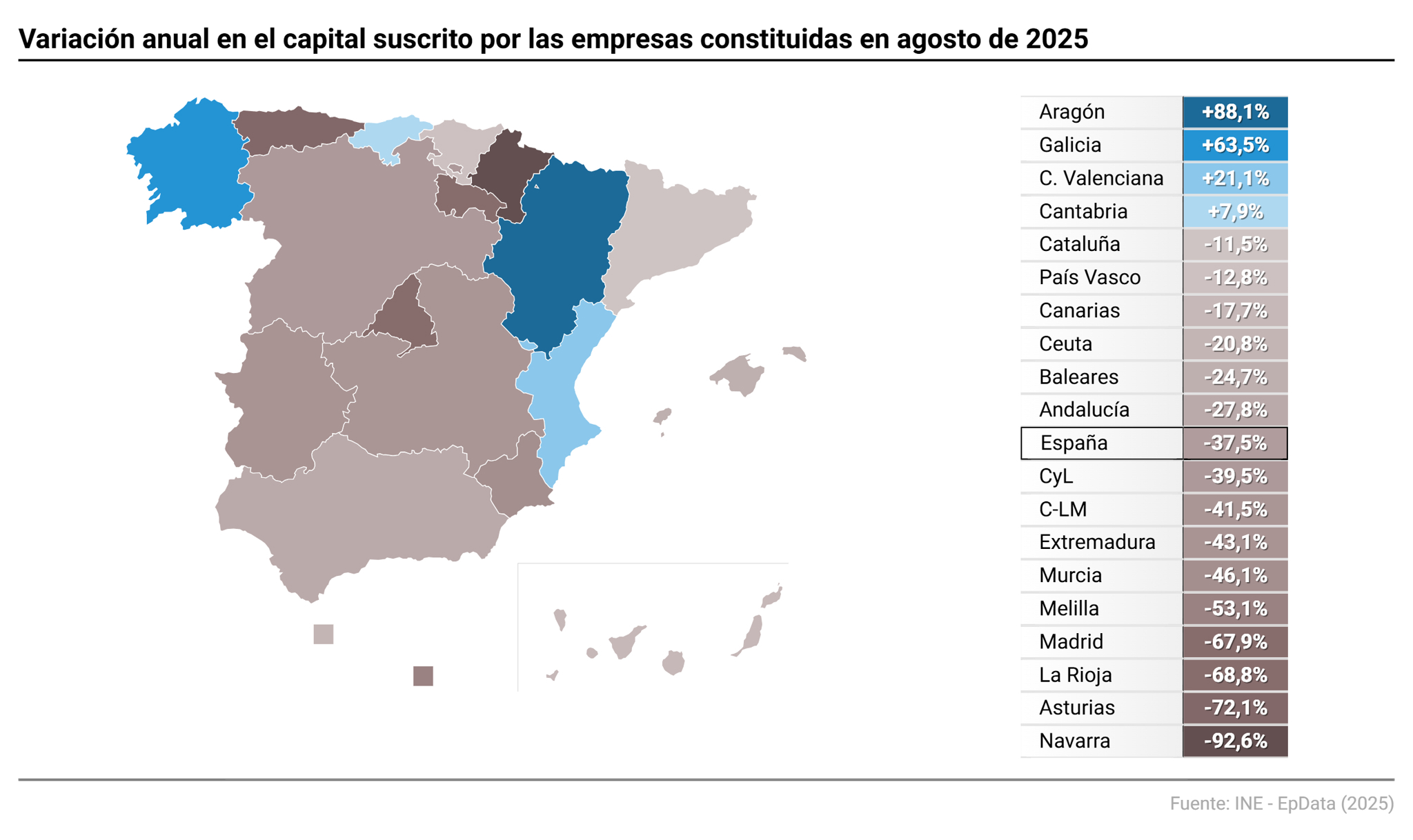 Según Estadística, País Vasco (24,1%), La Rioja (22,2%) y Andalucía (18,2%) presentaron los mayores aumentos anuales en el número de sociedades mercantiles creadas en agosto, al tiempo que Asturias (-39,4%), Navarra (-35,4%) y Región de Murcia (-31,2%) registraron los descensos más acusados.