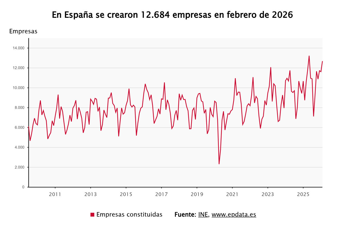 El número de nuevas sociedades mercantiles se disparó un 45% en febrero en comparación con el mismo mes de 2025, hasta sumar un total de 12.684 empresas, su cifra más elevada en un mes de febrero desde el año 2007, según los datos difundidos este lunes por el Instituto Nacional de Estadística (INE).