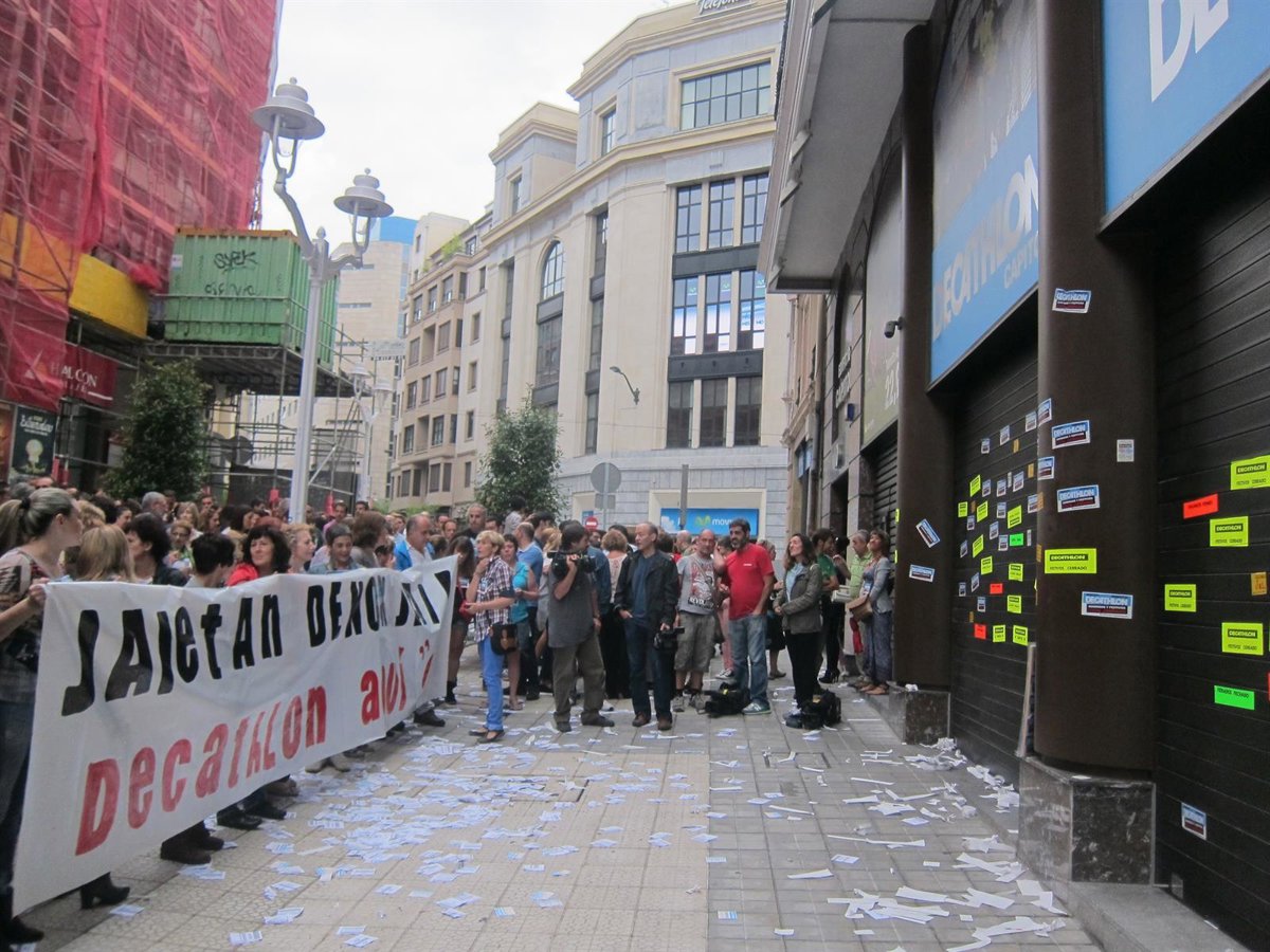 Decathlon ha abierto a las diez de esta mañana sus tiendas de San Sebastián, Irún y Vitoria, mientras la de Bilbao se mantenía cerrada a las once de la mañana ante una concentración de más de un centenar de personas, convocadas por ELA, LAB, CC.OO. y UGT, que se manifiestan contra la apertura de este comercio en festivo.