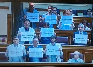 Durante la votación, los once diputados de IU-ICV-CHA se han puesto en pie y han sacado carteles donde se podía leer 'Rescatemos la democracia'. El presidente del Congreso, Jesús Posada, les ha llamado la atención dos veces, amenazándoles con echarles del hemiciclo si no retiraban los carteles, ha dado por válida la votación dado que la situación no había "distraído" a sus señorías, pero ha recordado que ese tipo de comportamientos están "prohibidos" por el Reglamento.